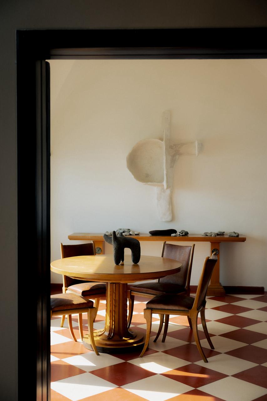 As a whole the space feels airy, lightly touched, almost minimal in its design. The palette of the main room is earthy and muted in tone: It has sandy-beige walls; an L-shaped bar made from lightly textured white Spanish tiles; low soft pillow lounge chairs next to marble tabletops that sit upon large slabs of grey rock. One wall displays a pair of sculptures that are composed of found rocks which were collected by the artist and then strung together to be transformed into lyrical free forms that give movement to otherwise inanimate objects. As with much of his work that uses found material, the rocks are sensitively handled—repurposed yet respected for the individual histories they hold. The most commanding element is the wall behind the bar itself—painstakingly formed by the artist’s hand using polystyrene and plaster—with an arrangement of irregular openings, or small caves, which range from shallow holes to dark receding voids. Directly inspired by Vlychada’s wind-carved rock formations, Gyàrfàs’s interpretation undulates along the wall, hugging the original cave-like architecture of the space. Its colour—a cool blue-ish shade of white—differentiates it from the others, transforming it from architectural feature to site-specific sculpture.